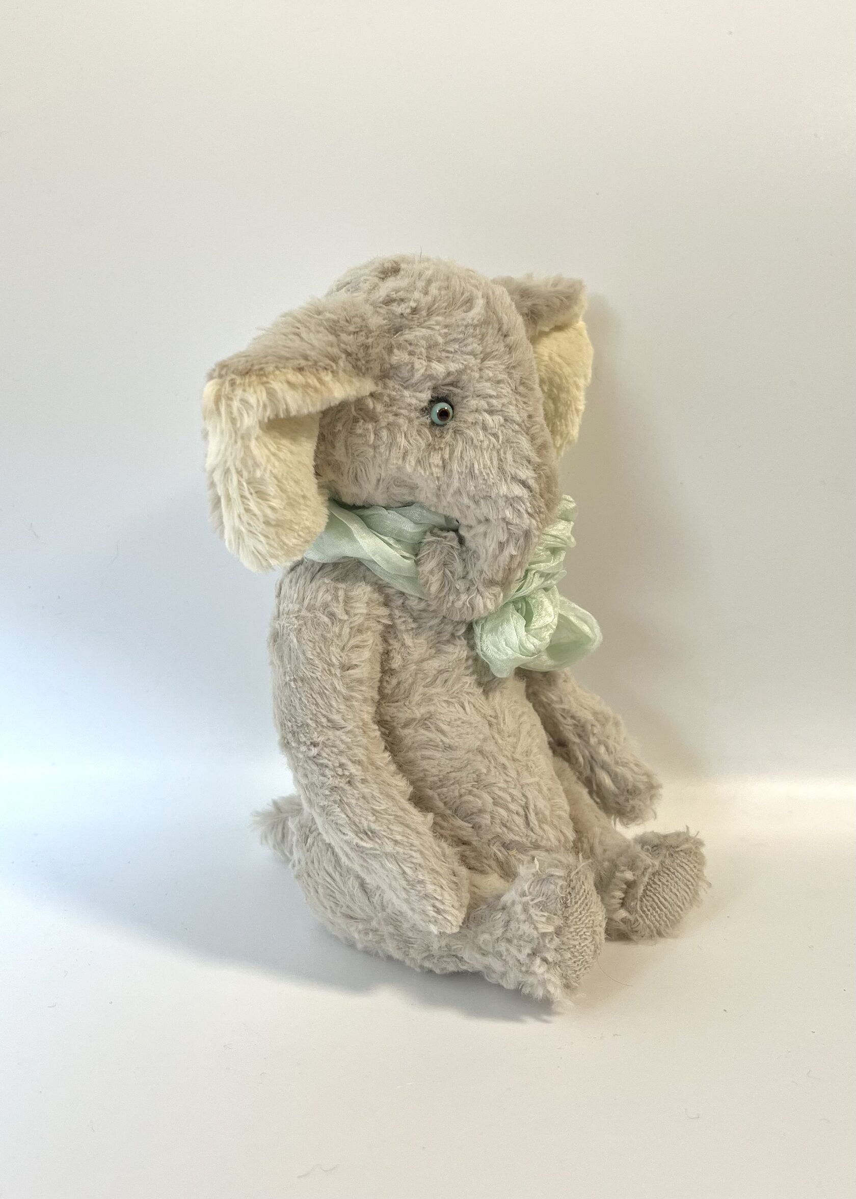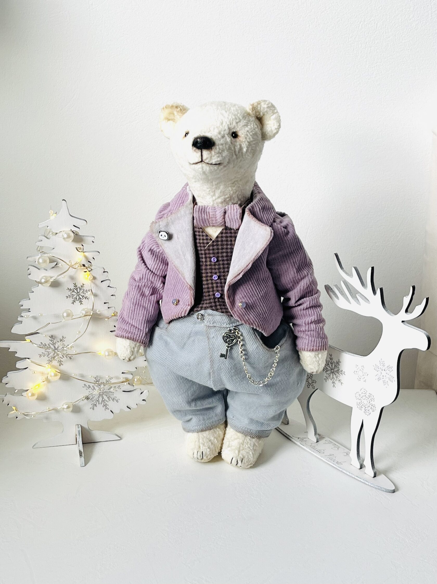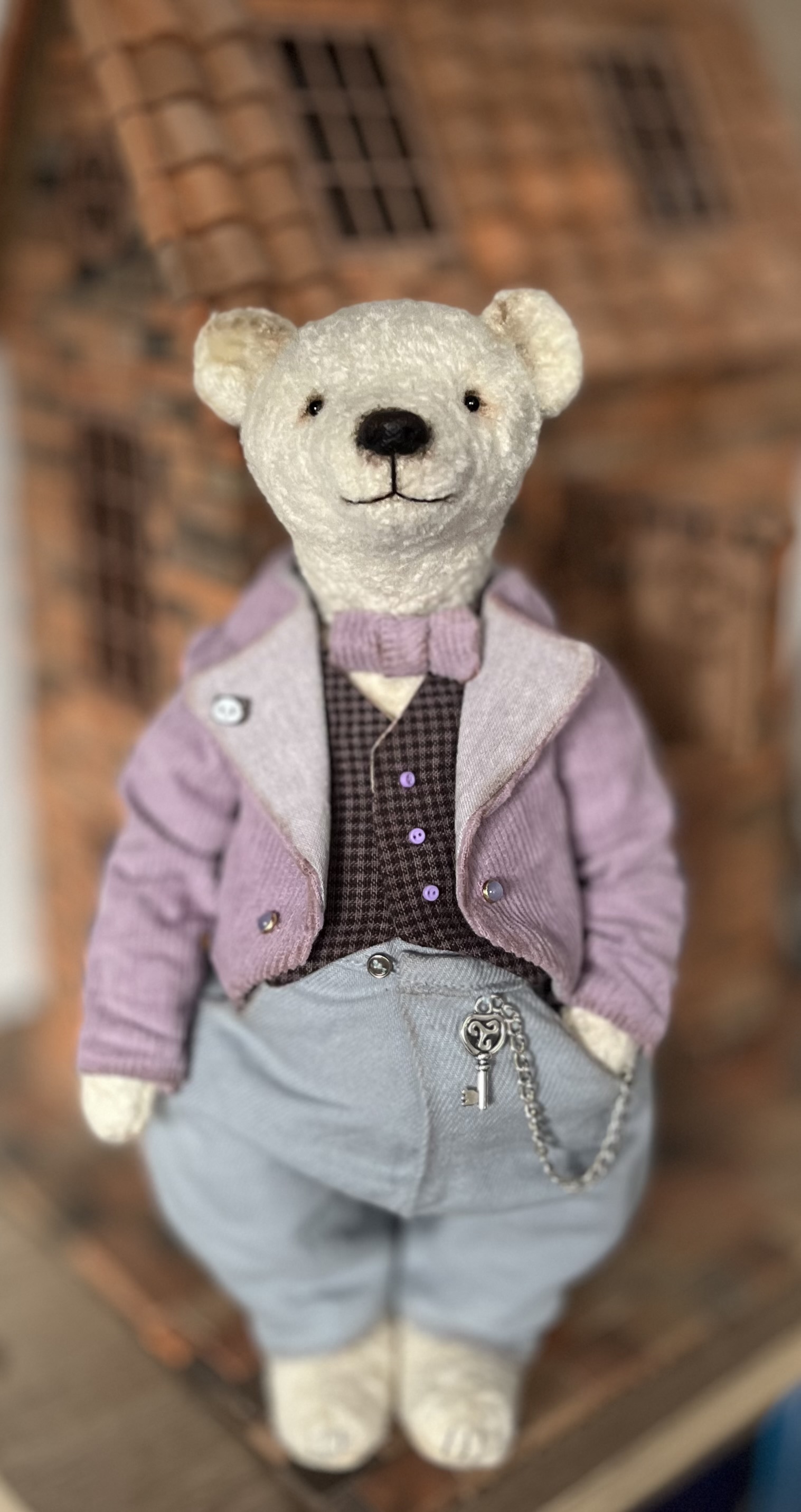 Медвежонок ручной работы, авторская выкройка, сшит по технологии Тедди из винтажного плюша, тонирован масляными красками, набит кедровыми опилками, имеет 5-шплинтовое крепление, благодаря которому у мишки вращается голова и лапы. Рост 25 см. Глазки пришивные, немецкие, стеклянные. Нос ручной лепки. Одежда сшита из натуральных тканей, костюм тройка, брюки с карманами, жилет и пиджак на подкладе, полностью снимается.